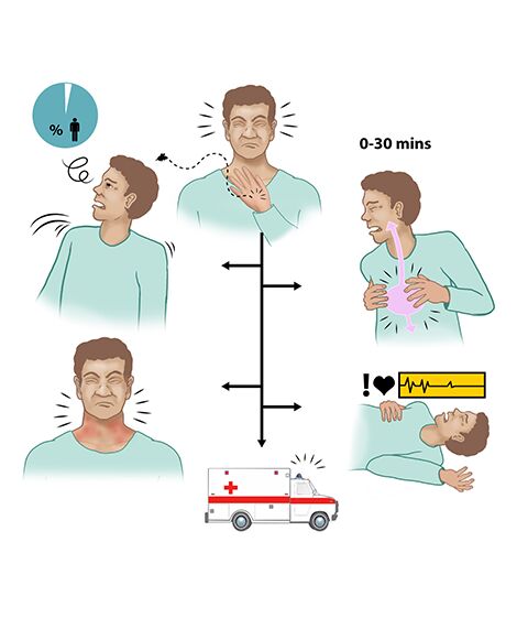 Grado 4 - grado 1 o 2 o 3, más palpitaciones del corazón, pérdida de conocimiento, choque anafiláctico (acompañado de mareos, sudoración excesiva y escalofríos)