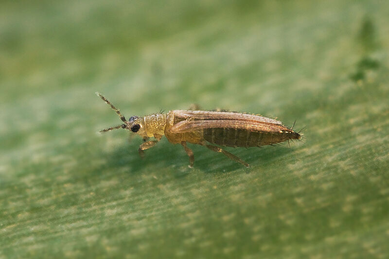 Los trips dañan las plantas al perforar las células de los tejidos superficiales y succionar su contenido, causando la muerte del tejido circundante. Las manchas gris plata y los puntos negros de sus excrementos delatan su presencia en el cultivo. Disminuye la vigorosidad de la planta debido a la pérdida de clorofila. Si la infestación es grave, las hojas pueden arrugarse.