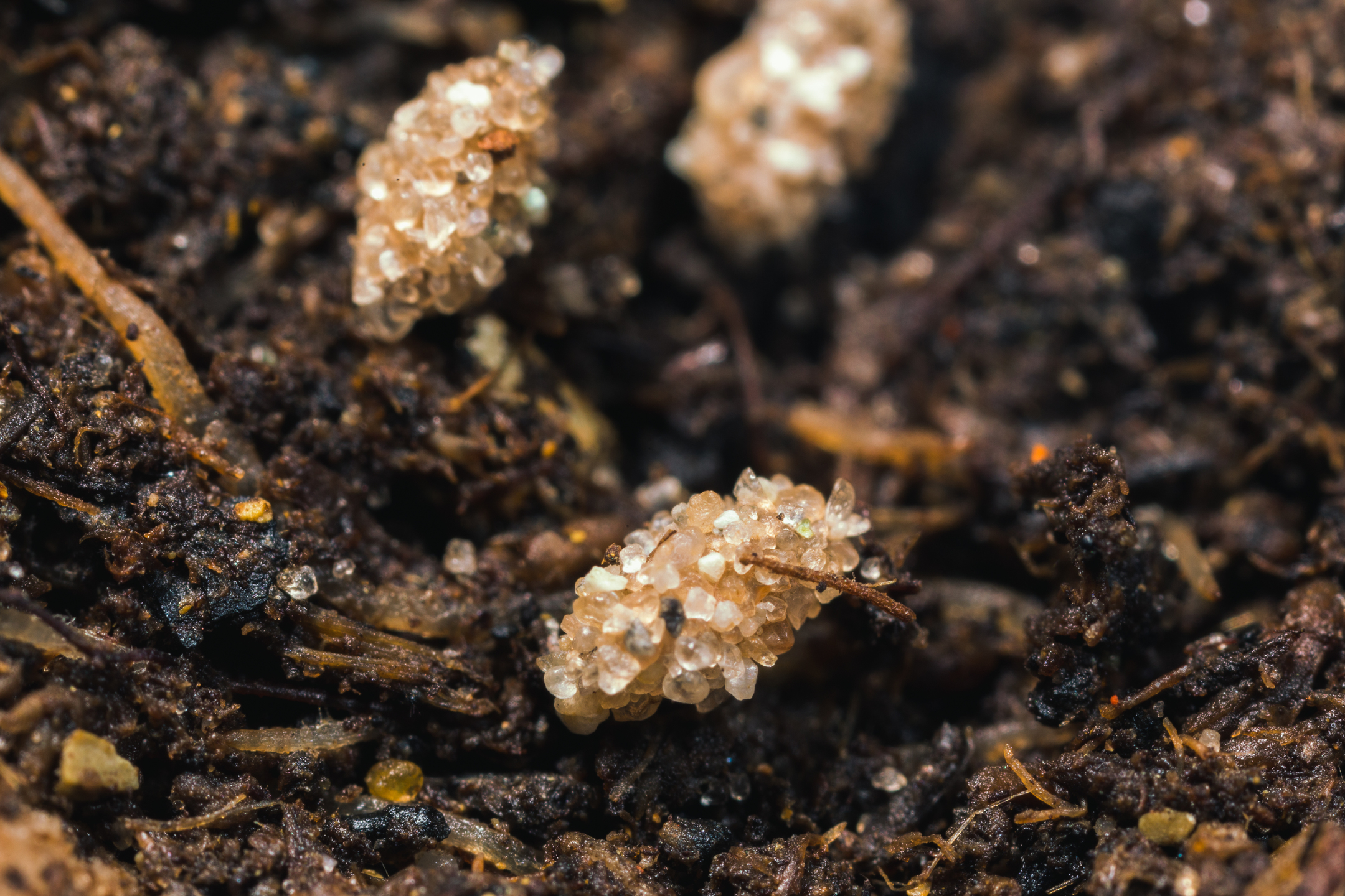 Fase de pupa: Cuando las larvas han crecido, saltan de las hojas y Aphidoletes aphidimyza pupan en la capa superior del suelo húmedo, donde forman un capullo de seda ovalado construido con largos hilos pegajosos. Los capullos están cubiertos de pequeñas partículas de tierra y miden unos 2 mm de largo.