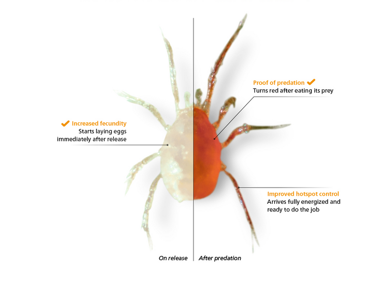 Los Phytoseiulus persimilis adquieren un color rojo después de comer a su presa. Tras consumir varias arañas rojas, su color cambiará gradualmente al característico color rojo anaranjado. Este proceso dura entre 1 y 2 días. Tras la introducción de Spidex Vital (blanco), se podrá comprobar con certeza que se depredan presas, ya que se observarán Spidex Vital de color rojo.